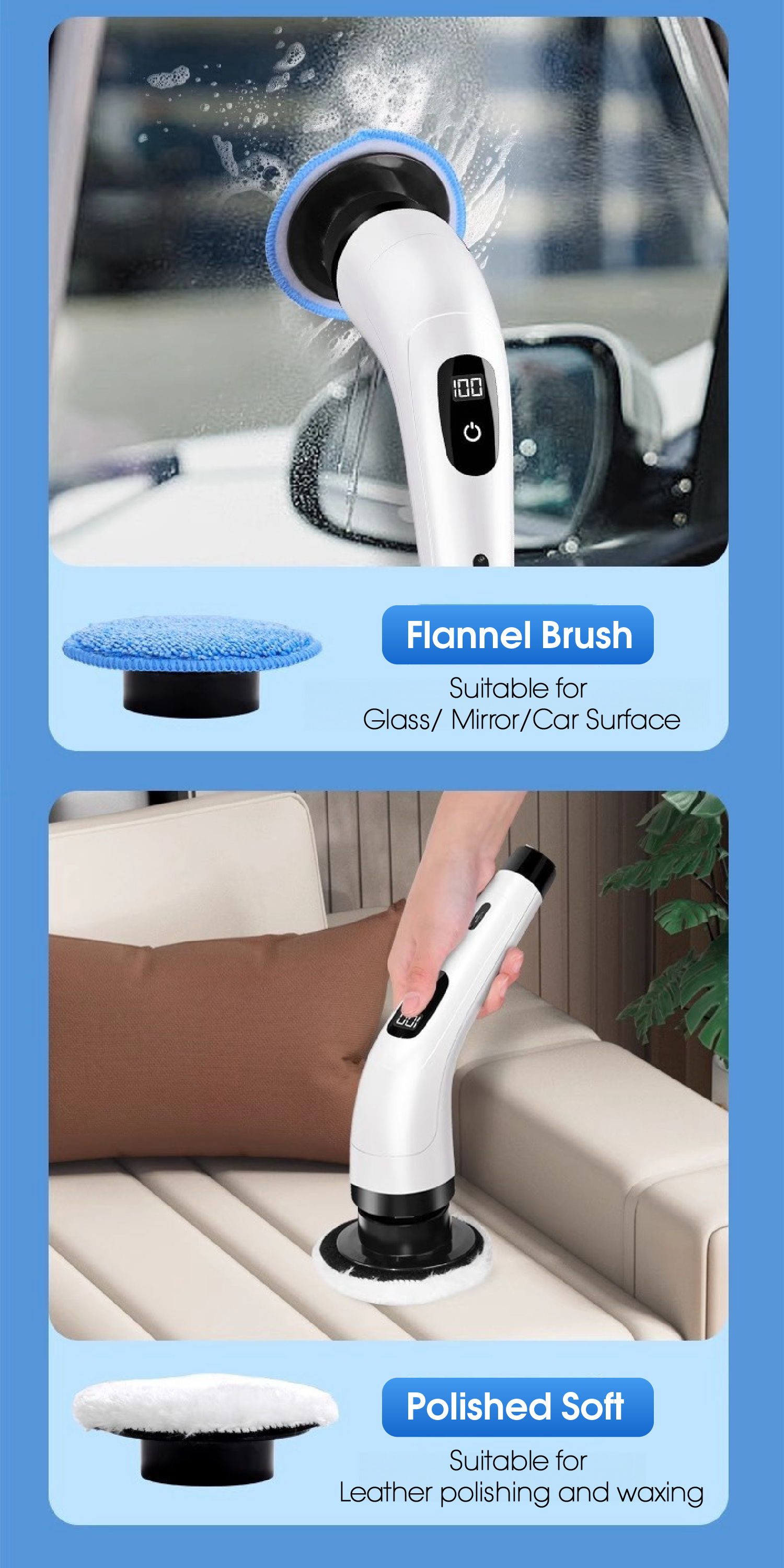 • Flat Brush Heads: Great for stovetops, countertops, and metal surfaces